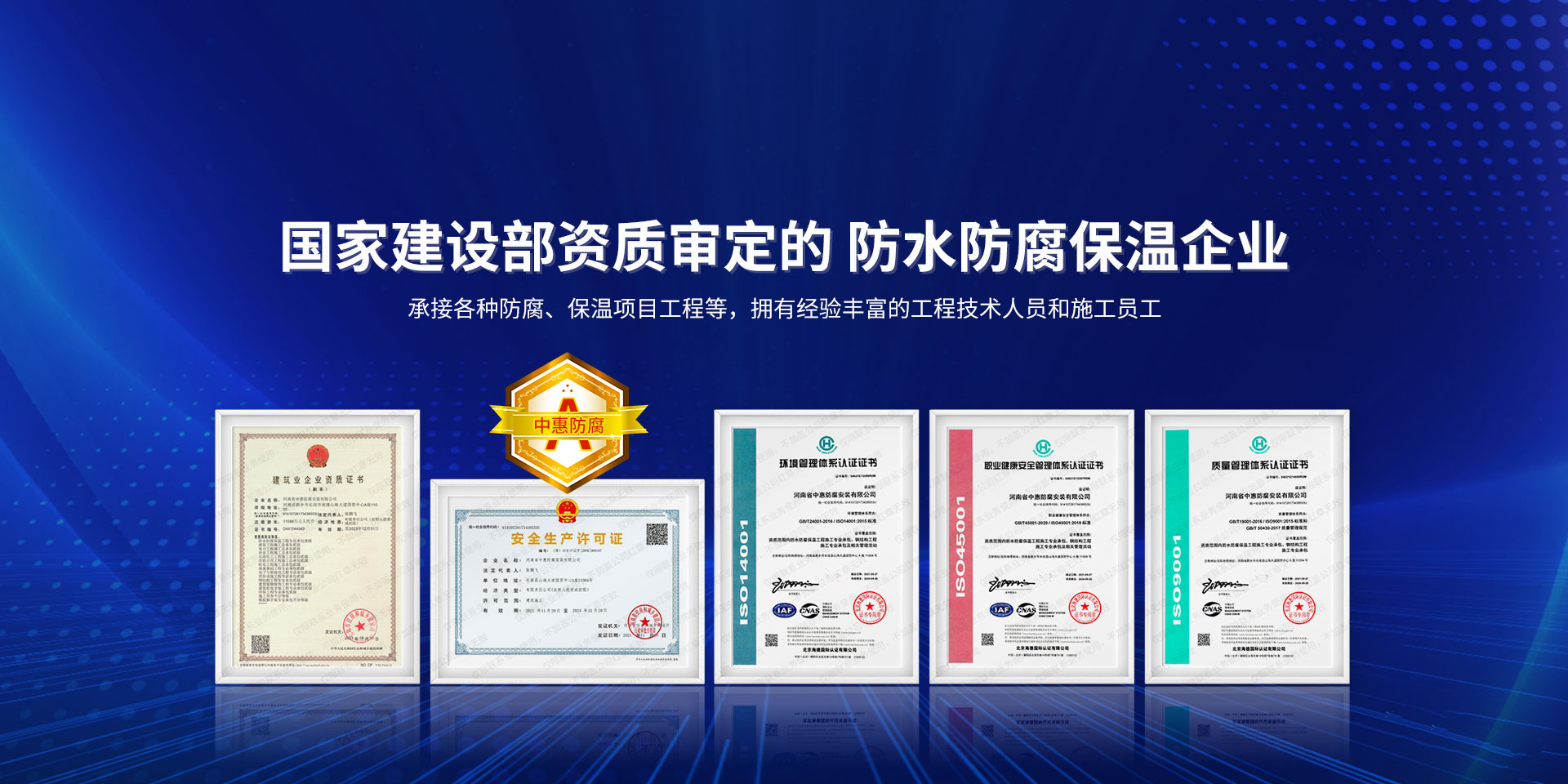公司經營范圍:防水防腐保溫工程;消防設施工程;建筑裝修裝飾工程;建筑機電安裝工程;電力工程;建筑工程;石油化工工程;工業清洗工程;油罐清洗工程;鋼結構工程;環保工程;模板腳手架工程;電纜防火封堵、防污閃噴涂、外墻外保溫工程;各類施工勞務作業;設備維修、船舶鉚焊、涂裝;電力工程材料、建材、防水材料、防火材料、防腐保溫材料銷售,并相繼通過了GB/T19001-2008idtISO9001:2008GB/T50430-2007質量管理體系認證證書。GB/T24001-2004idtISO14001:2004環境管理體系認證證書。GB/T28001-2011idtOHSAS18001:2007職業健康安全管理體系認證證書。公司是中國防腐蝕于防護協會、中國施工企業管理協會、電力協會和中國鋼結構防水協會會員單位。 公司的經營業務涵蓋了石油、化工、電力、冶金、煤炭、船舶、國防、燃氣、水利、環保、交通運輸、航空及國防軍工和輕紡市政等行業的防腐保溫絕熱設備。鋼結構安裝、防火、防水、金屬噴鍍、聚脲噴繪、陰極保護、防滲透堵漏、玻璃鋼及各種磚版材料襯里、橡膠襯里、煙氣硫和耐酸溶劑腐蝕等工程施工。公司連續十年榮獲“省市先進施工企業”“安全生產先進單位”“重合同,守信用企業”和“AA***資質企業”的稱號。2000年被命名為市級文明單位,2002年被國家工商行政管理局命名為“重合同,守信用的企業”、被中國工業防腐蝕技術協會命名為“防腐蝕企業,能源節約及環境保護領域有豐富的經驗和***的業績。工程一次交驗合格率100%。其中攀枝花鋼鐵公司煉鐵廠四號高爐及熱風爐防腐工程、上海寶鋼公司煤氣柜防腐工程、撫順石油一廠裝置防腐項目、齊魯石化公司稀烴廠高塔防腐工程、吉林化學工業公司煉油廠油罐防腐工程、天津石化熱電廠六號爐頂棚聯絡管保溫工程、大慶油田(太倉)力神泵業工程、中國化學工程第十一建設工程、中原油田勘探局工程、中國石化銷售有限公司華北分部、魯皖輸油管道工程、貴州開磷息烽合成氨工程、陜西黃陵煤化工程、中國石油天然氣西部管道塔里木輸油工程、邯鋼集團邯寶鋼鐵公司煉鐵工程、德州供電工程、吉寶(南通)船廠工程,偃師華潤熱力工程、鄭州熱力總公司。 河南省中惠防腐安裝有限公司愿以豐富的施工經驗,***的技術,***的設備,***的管理,***的服務,竭誠為國內外廣大的用戶提供***滿意、******的工程作品。 我公司愿與國內外同仁一道,團結協作,共同推進防腐蝕行業發展! 公司地址:河南省長垣縣建設路北段360號 固定電話:0373-8866488 郵編:453400 網址:http://www_zhff_com_cn.free1668.com